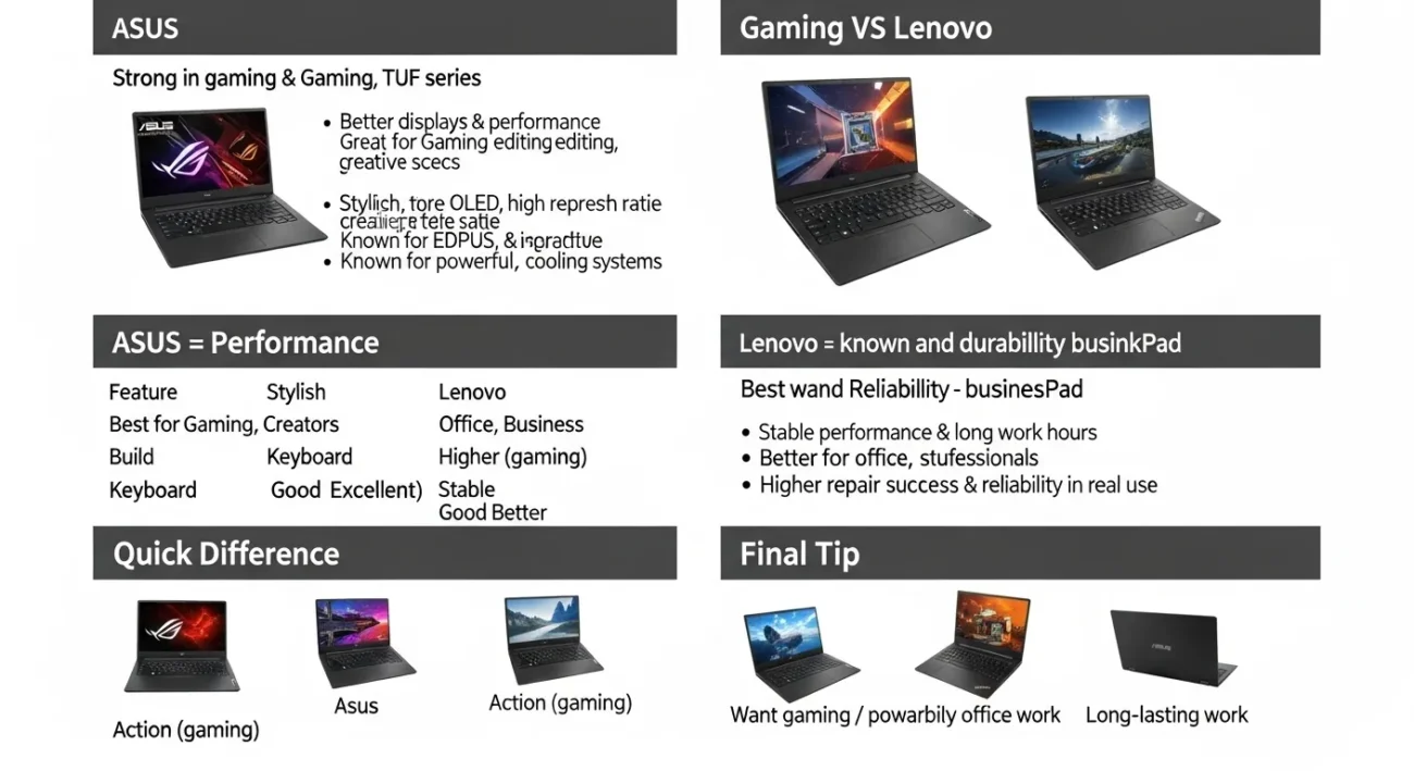 When I compare Asus or Lenovo, I clearly see that both brands are strong but made for different users. Asus focuses on performance, speed, and modern features. It is a great choice for gamers and users who need powerful machines. Its laptops often look stylish and perform well in heavy tasks like gaming and editing.