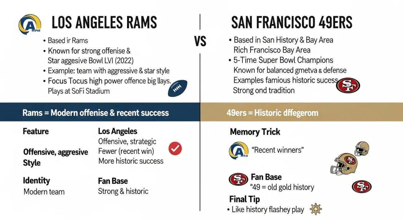 If you are confused between “Rams or 49ers,” the key difference is that the 49ers are more consistent and dominant over time, while the Rams are known for winning big games and championships.